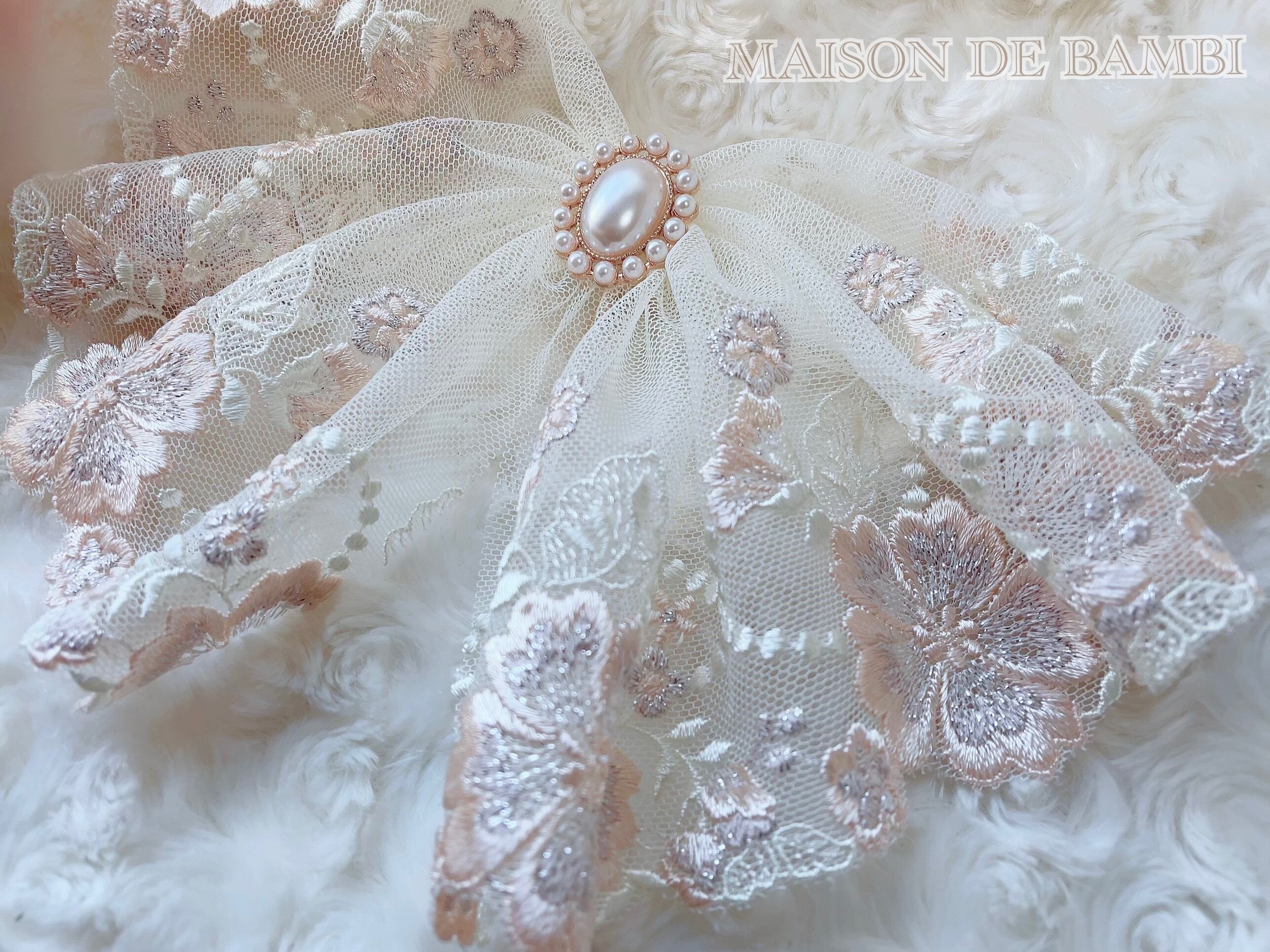 アイボリーのチュールレースに刺繍が美しいポニーフックです⋈*。゚